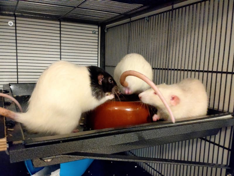 Morgendlichen Gewusel beim Frühstück. Jeder hat da seine eigene Taktik. Das Beste wegschleppen, am Napf sitzen bleiben und rein schaufeln, IM Napf sitzen und die Brüder blockieren...