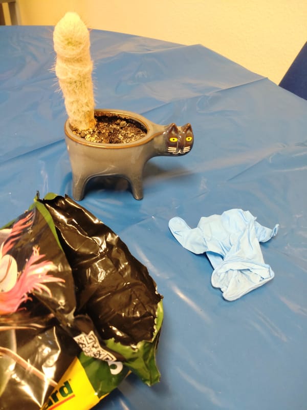 Mein Katzenkaktus hatte in der letzten Zeit größeren Erdschwund. Nun habe ich dran gedacht Ersatz mitzubringen. Jetzt ist alles wieder hübsch und hoffentlich gut versorgt.