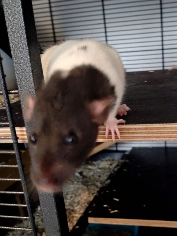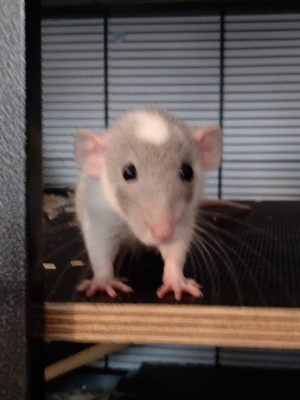 Einer der beiden neugierigsten und zutraulichsten Jungs. Er lässt sich bereits gut greifen und klettert gerne auf mir herum. Käfig sauber machen findet er allerdings noch sehr gruselig.