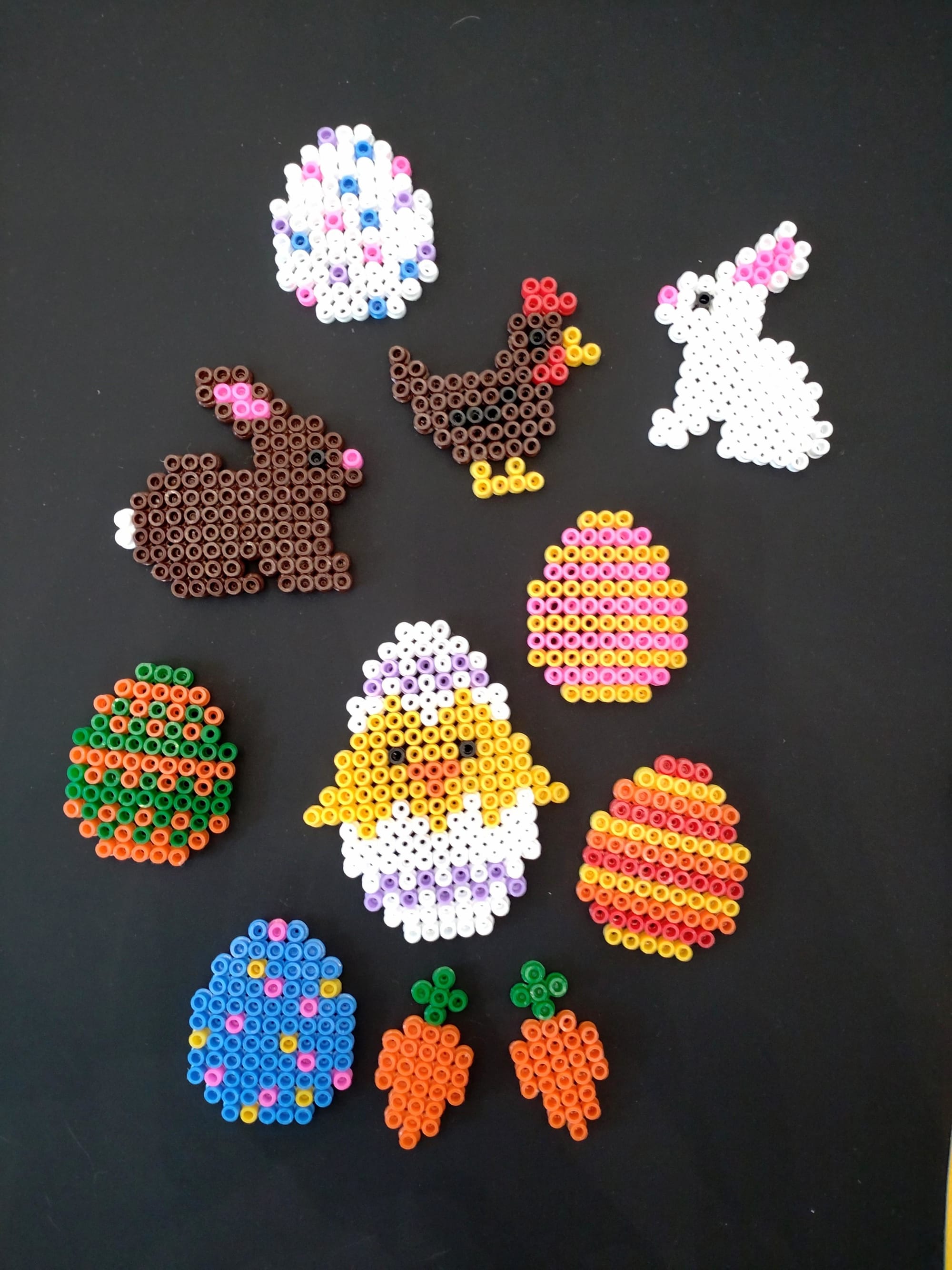 Ich weiß nicht mehr auf welchem Blog ich es gesehen hatte, aber irgendwo war da ein Hase aus Bügelperlen. Letztes Jahr hatte ich versucht Anhänger aus lufttrocknender Modelliermasse zu machen. Die sind mir aber alle beim trocknen "verzogen". Also hatte ich gar keine Anhänger. Da ich eh gerade im Bastelzimmer aufgeräumt hatte und die Bügelperlen draußen standen, habe ich also Welche aus den Perlen gemacht: