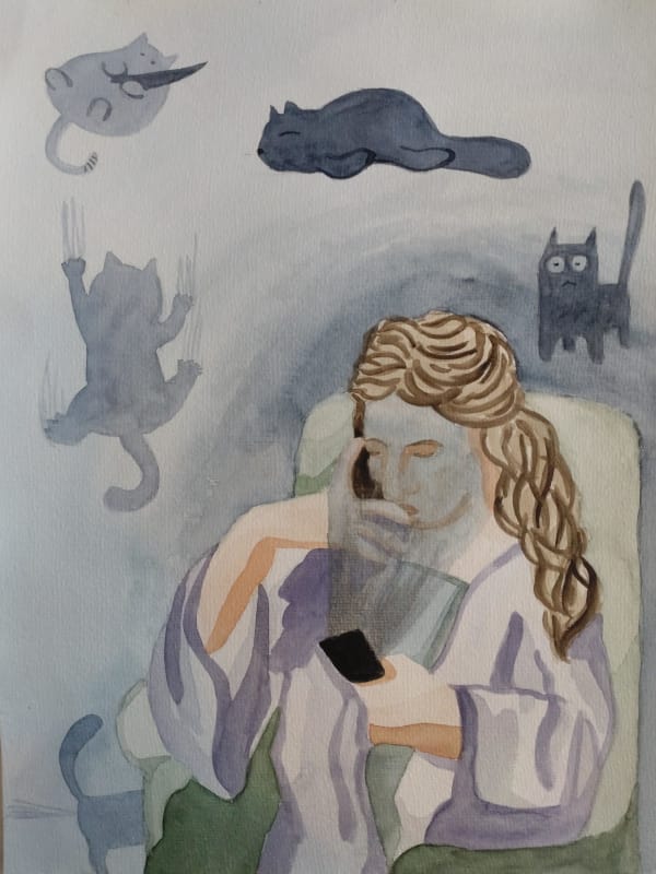 Hinzu kommt ein Bild von Picasso (Lesende Frau), welches wir in die Neuzeit "geholt" haben. Meine Dame schaut sich ganz klassisch Katzenvideos auf dem Handy an: