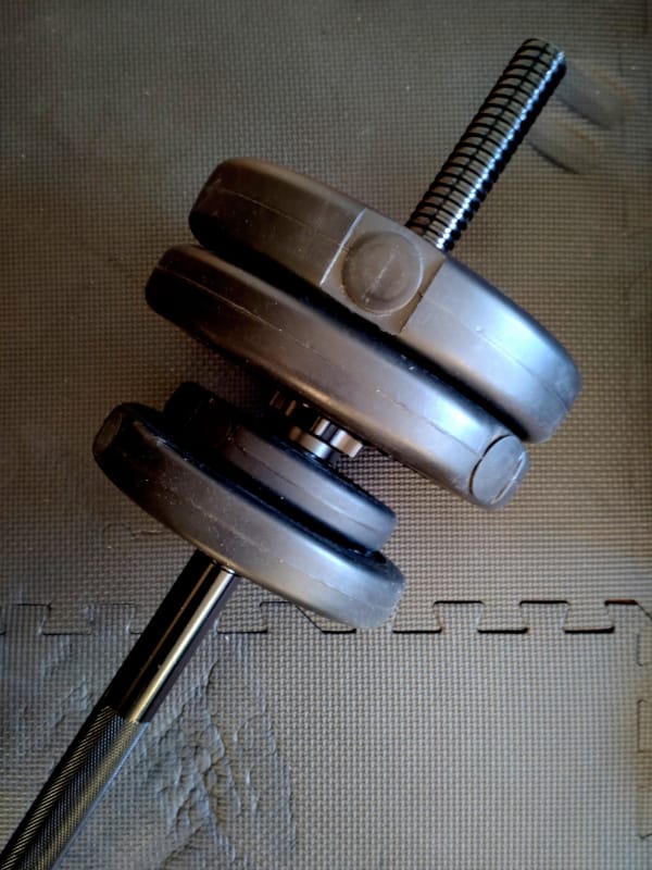 Wenn es passt oder wenn ich es nicht zum "Bootcamp" oder zum Rehasport schaffe (oder es ausfällt), dann versuche ich was zuhause zu machen. Inzwischen meist wieder Langhanteltraining. Ich habe eine 160cm lange Stange die alleine bereits 10 kg wiegt. Das die so lang ist ist wichtig, da ich sie auch "Hochkant" nutze und ich sie für die Übungen auf Schulterhöhe greifen können muss. Je nach Übung kommen mehr oder weniger Gewichte dran. Aktuell so um de 5 kg würde ich sagen. Langhanteltraining geht aber nicht immer. Dann habe ich alternative Übungen.