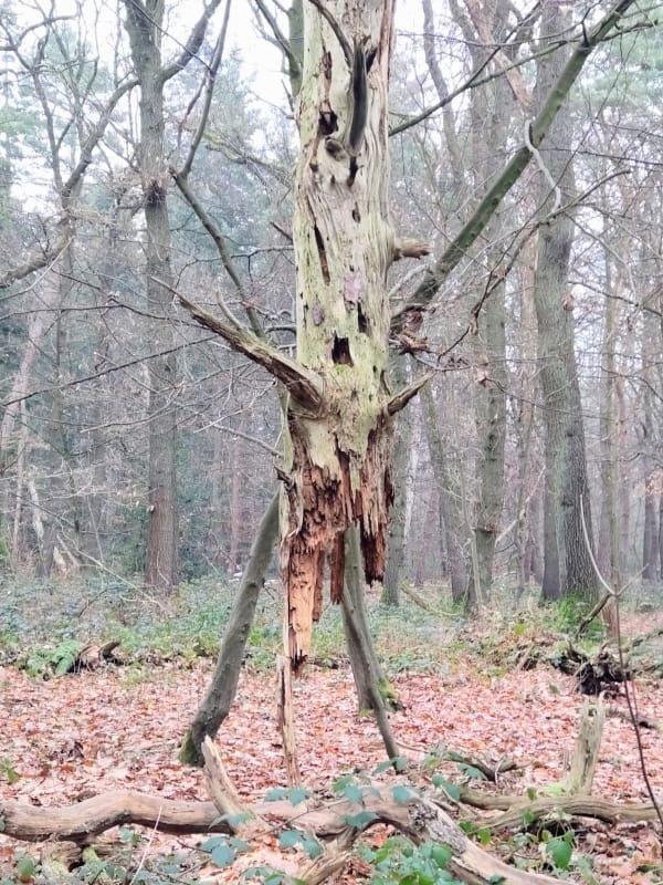 Diesen "Baum" musste ich einfach fotografieren. Der Normalfall ist ja eher der, dass ein morscher Baum umfällt und dann ragt da noch ein Stück aus der Erde und der obere Teil ist irgendwo verstreut. Hier ist es anders Herum. Hier fehlt der untere Teil des Baumes. Der obere Teil wird weiter von den Bäumen drumherum gehalten. Faszinieren, aber irgendwie auch gruselig.
