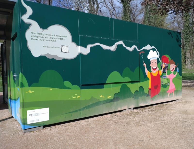 Was ich weiterhin nicht raus gefunden habe, ist wofür dieser Container da ist. Er hat auch noch eine Überdachung an der linken Seite. Durch das "Grillbild" und diese Klappe an der Seite würde ich ja einen Verkauf vermuten, aber der QR-Code (wo man angeblich mehr erfährt) führt nur auf die allgemeine "Nachhaltigkeitsseite" der Gemeinde.