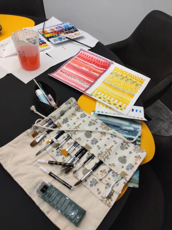 Wenn ich male oder anderweitig kreativ bin, dann mache ich Chaos und brauche Platz. Eigentlich habe ich da "oben" einen extra Tisch für, aber da halte ich mich aktuell irgendwie nicht so arg gerne auf. Also müssen der Schreibtisch oder der Esstisch herhalten. Später werde ich da also noch was aufräumen...